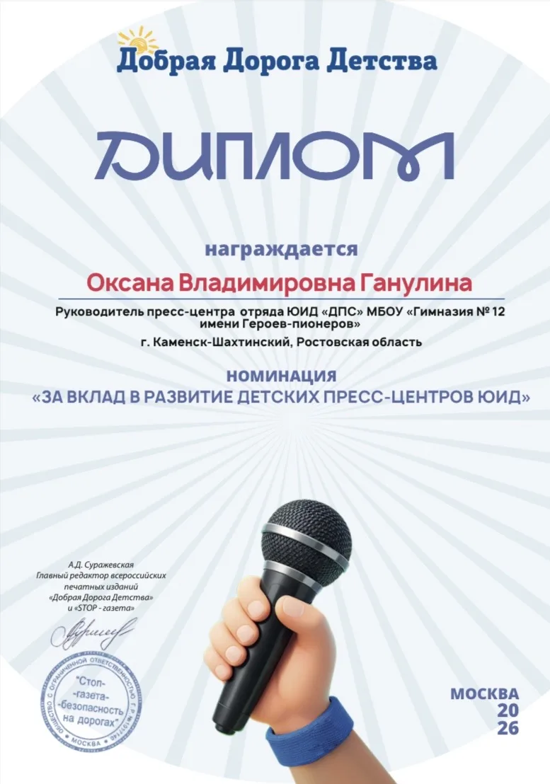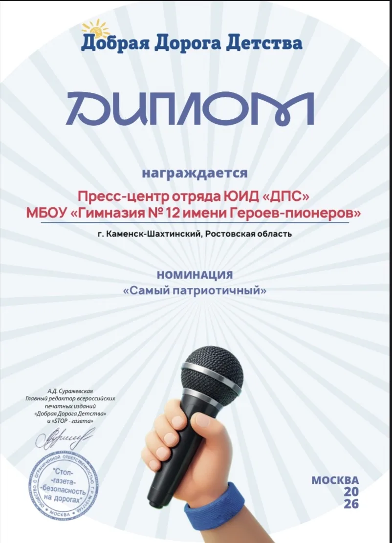 В номинации «Лучшие пресс-центры 2025» пресс-центр отряда ЮИД «ДПС» МБОУ гимназии N° 12 г. Каменск-Шахтинского отмечен как «Самый патриотичный».