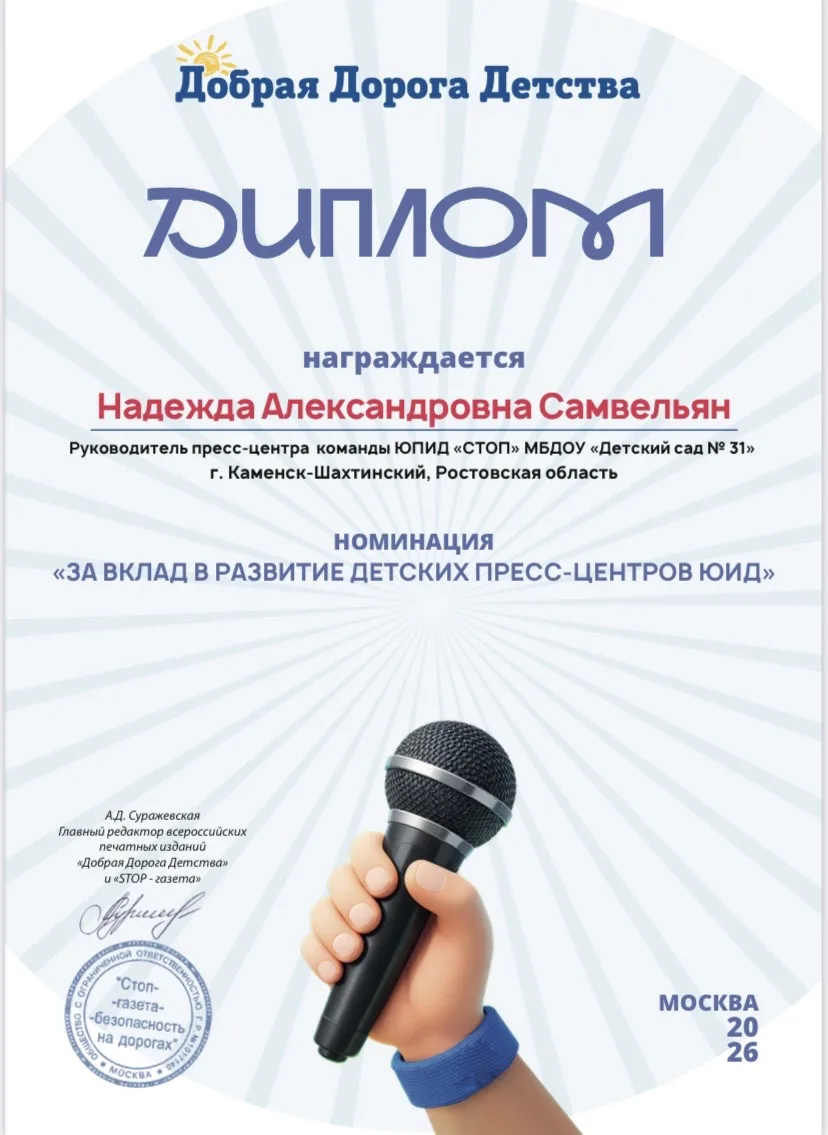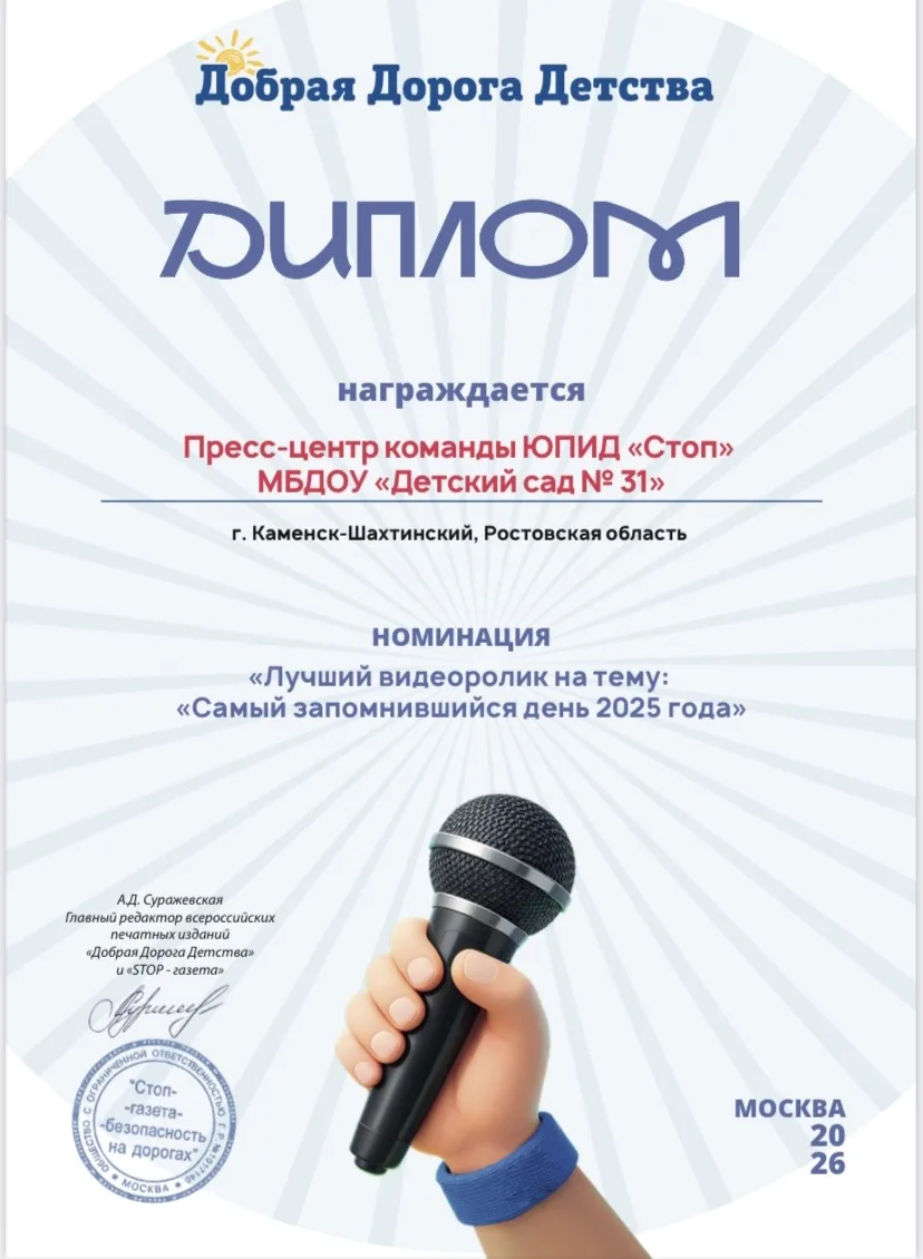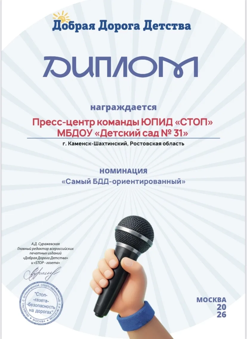 В номинации «Лучшие пресс-центры 2025» - пресс-центр команды ЮПИД «СТОП» МБДОУ детский сад N° 31 г. Каменск-Шахтинского отмечен как «Самый БДД - ориентированный».
