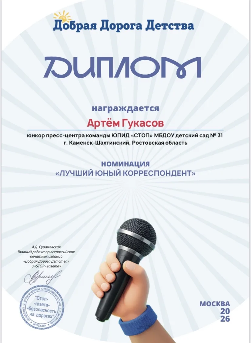 В номинации «Лучшие юный корреспондент» - юнкор пресс-центра команды ЮПИД «СТОП» МБДОУ детский сад N° 31 г. Каменск-Шахтинского Артём Гукасов.