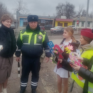 В преддверии самого ожидаемого весеннего праздника, 8 марта, девчонки из отряда ЮИД "Радар" МБОУ Тарасовской СОШ 1 Ростовской области со старшим лейтенантом ИДПС ОГИБДД России по Тарасовскому району Лагутиным Д.В. поздравили прекрасных женщин.